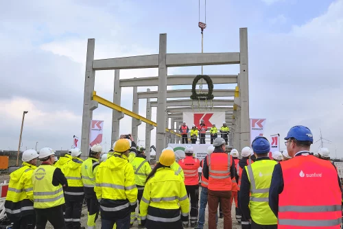 Auf der Elektrolyse-Baustelle wurde ein wichtiger Meilenstein erreicht. Nachdem zum Monatsbeginn die Stützen und Binder sowie die Kranfahrbahn des Elektrolysegebäudes moniert wurden, konnte am 21.03. das Richtfest des Gebäudes im Beisein aller Partner gefeiert werden. Im Anschluss daran wurde mit der Betonage der Bodenplatte und der Wände begonnen. Das Elektrolysegebäude bildet künftig die Außenhülle des Elektrolyseurs. Weiterhin konnten Fortschritte bei der Errichtung der Energiezentral erzielt werden. Nach dem Start der Mauerarbeiten im vorherigen Monat konnte im März das Setzen und Montieren der Decken erfolgreich abgeschlossen werden. Zudem haben auch für das Nebengebäude die Mauerarbeiten gestartet. Parallel dazu spielte das Thema Wasser eine wesentliche Rolle auf der Baustelle. So konnten sowohl das Regenrückhaltebecken als auch das Löschwasserbecken im vergangenen Monat montiert und verspannt werden. Darüber hinaus haben die Baumaßnahmen zur Würdebacheinleitung begonnen und die Baustelle verfügt nun über einen Trinkwasseranschluss. Der Anschluss für Bauwasser war bereits im Februar erfolgt.