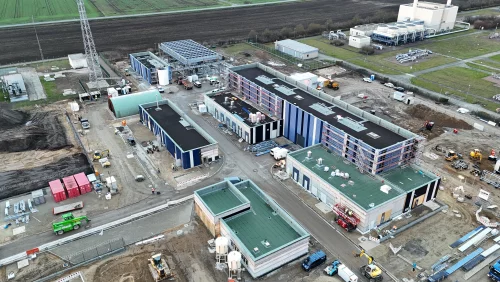 Im Inneren des Elektrolysegebäudes stand im Dezember die Fertigstellung des Sockels im Mittelpunkt – ein essenzieller Schritt, um die bevorstehende Anlieferung der nächsten Komponenten vorzubereiten. Diese Anlieferung wird ein Highlight, auf das das gesamte Team bereits mit Spannung hinfiebert. Parallel dazu ging es auch an den Fassaden des Elektrolyse- und der Nebengebäude weiter. Der einst kahle, graue Beton weicht zunehmend modernen blauen und weißen Streifen, die dem Gebäude ein ansprechendes Erscheinungsbild verleihen. Ein weiterer bedeutender Fortschritt war die vollständige Montage der Rotoren und des Wärmetauschers für den Luftkühler. Diese zentralen Bauteile wurden bereits im November angeliefert. Der Luftkühler wird die beim Elektrolyseprozess entstehende Wärme effizient und ressourcenschonend mit Umgebungsluft abkühlen. Die Verrohrung zur Integration des Luftkühlers ins System ist für Februar vorgesehen Auch in den Anbauten und Nebengebäuden gibt es Fortschritte. Die Arbeiten an der Technischen Gebäudeausrüstung sind in vollem Gange: Heizungs-, Lüftungs- und Klimatechnik, Gebäudeautomation und Sanitärinstallationen schaffen die Grundlage für einen effizienten und reibungslosen Betrieb.