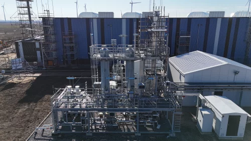 Ein bedeutender technischer Meilenstein wurde im Januar erreicht: Der physische Netzanschlusspunkt zur TotalEnergies Raffinerie Leuna ist hergestellt. Damit ist das Anlagensystem von Produktionsbeginn bis zur Lieferung zum Kunden über Rohrleitungen miteinander verbunden. Eine Steckscheibe trennt die Systeme derzeit noch bis zum späteren Produktionsbeginn voneinander ab. Die infrastrukturelle Verbindung ist damit geschaffen.