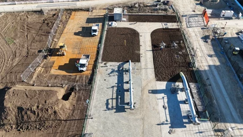 Auch beim Netzanschluss der TotalEnergies Raffinerie gehen die Arbeiten gut voran. Im Bereich der Regelanlage ist der Rohbau im Gebäude weitgehend abgeschlossen. Parallel laufen die Rohrbauarbeiten, die kontinuierlich weitergeführt werden, um die geplante Inbetriebnahme vorzubereiten.