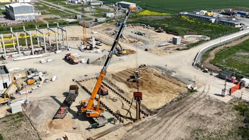 Auf der Baustelle des Elektrolyseurs wurde die Betonage der Wände des Elektrolysegebäudes fortgesetzt. Ende Mai wurde zudem mit dem Einheben der Fertigteilwände begonnen. Auch die Dachdeckerarbeiten für das Nebengebäude und die Energiezentrale wurden im Mai fortgeführt. An beiden Gebäuden wird derzeit an der Dämmung gearbeitet. Weiterhin konnte die Installation des Regenrückhaltebecken finalisiert werden, lediglich die abschließende Dichtigkeitsprüfung des Beckens steht noch aus. Ganz neu begonnen wurde im Gegensatz dazu mit den Arbeiten für das Verwaltungsgebäude. Dabei konnte im Mai bereits der Erdaushub für dieses abgeschlossen werden.