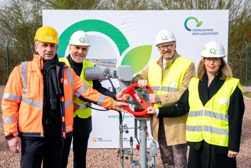 Feierliche Inbetriebnahme von Transportleitung im Energiepark Bad Lauchstädt durch ONTRAS: Erstes Teilstück des Wasserstoff-Kernnetzes in Ostdeutschland. v.l.n.r.: Gunar Schmidt, ONTRAS-Geschäftsführer Betrieb und Sicherheit; Prof. Dr. Armin Willingmann, Sachsen-Anhalts Minister für Wissenschaft, Energie, Klimaschutz und Umwelt; Thomas Kralinski, Amtschef und Staatssekretär Sächsisches Staatsministerium für Wirtschaft, Arbeit, Energie und Klimaschutz; Cornelia Müller-Pagel, Projektleiterin des Energiepark Bad Lauchstädt und Leiterin Grüne Gase bei VNG AG. © Foto: Tom Schulze