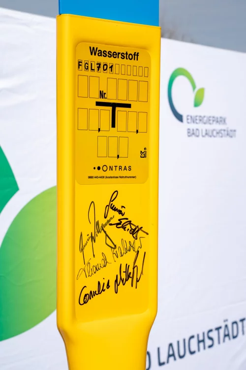 Markierungspfosten für Wasserstoff mit Unterschriften der Festredner. © Foto: Tom Schulze