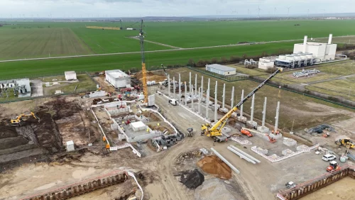 Auf der Baustelle der Elektrolyse sind im Laufe des Februars erkennbare Fortschritte zu verzeichnen. Dazu zählt im Besonderen die Errichtung und Montage der Fertigteile sowie der Kranfahrbahn der künftigen Elektrolysehalle. Außerdem haben die Maurerarbeiten für die Energiezentrale begonnen. Mit dem Einsetzen der Amphibienstopprinne konnte im Februar zudem die letzte Genehmigungsauflage für den Elektrolyseur erfüllt werden. Weiterhin verfügt die Baustelle nun über einen Wasseranschluss, der diese mit Bauwasser versorgt. Ein Trinkwasseranschluss folgt zeitnah.