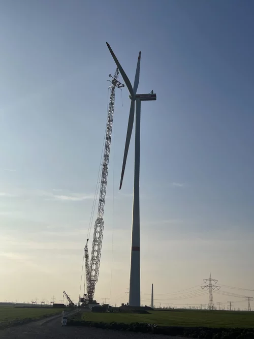 Auf der Baustelle des Windparks konnte bereits die vierte Windenergieanlage ans Netz gebracht werden. Starke Winde stellten eine besondere Herausforderung bei der Installation der Rotorblätter dar. Dennoch steht auch die Inbetriebnahme des fünften Windrads zeitnah bevor.